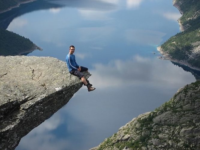 Скала "Язык Тролля" (Норвегия) "Язык Тролля" образовался, когда кусок скальной породы откололся от массива горы Скьеггедаль (Skjeggedal), однако из-за сравнительно небольшого веса не упал вниз, а завис на высоте 350 метров над рекой. Сейчас под скалой "Язык Тролля" находится искусственно созданное (в результате запруды реки) озеро Ringedalsvatnet. Сама гора Скьеггедаль расположена примерно в 10 километрах от городка Одда (Odda).