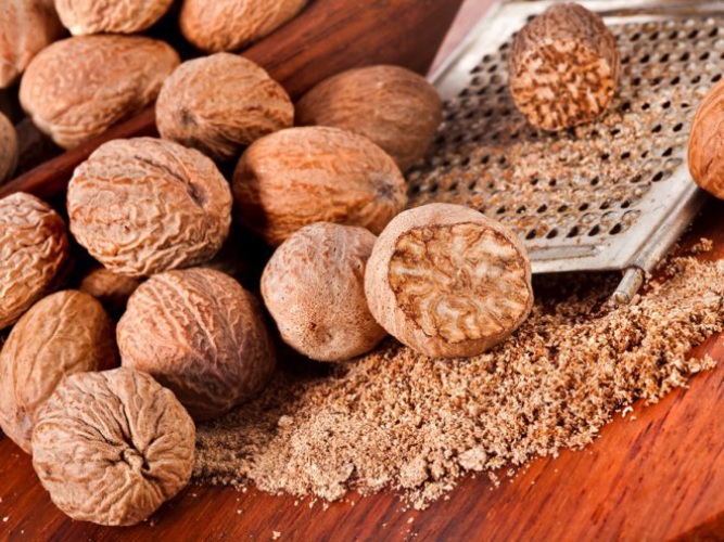 Полезные свойства мускатного ореха Состав и наличие полезных веществ Ядра мускатного ореха содержат витамины (А, группы В, РР, Н, Е), минералы (фосфор, магний, железо, кальций, хлор, сера, натрий, цинк, медь, йод и прочие), эфирные масла, крахмал и пектин. Полезные и лечебные свойства При употреблении молотого мускатного ореха в малых дозах проявляются его положительные свойства. Он оказывает сильное стимулирующее и тонизирующее воздействие на сердечно-сосудистую, нервную системы. Мускатный орех применяется в восточной медицине для лечения мужчин с быстрой эякуляцией, импотенцией и прочими расстройствами, связанных с отсутствием сексуального влечения и, как результат, возбуждением. Совсем небольшие дозы мускатного ореха способны успокоить нервную систему, вернуть утраченный сон. Добавляя его для согрева в массажное масло или горячий чай можно избавиться от первых признаков простуды и повысить иммунитет. Если приготовить на основе мускатного ореха и теплого подсолнечного масла густую пасту, то ее можно использовать для лечения миозита, артрита, ревматизма и остеохондроза. Для этого еще теплую пасту накладывают на больное место, прикрывают полиэтиленом и теплой тканью. Оставляют такой компресс на 10-20 минут до полного остывания. Мускатный орех прекрасно помогает при запоре, диареи и прочих нарушениях работы желудка и кишечника, а также при потере аппетита, излишнего газообразовании. Для этого следует смешать нежирный йогурт, воду (по 125 г.), сухой имбирь и мускатный орех (по 1/3 ч.л.). Полученную смесь выпить залпом. В кулинарии Молотый мускатный орех широко применяется в пищевой промышленности и кулинарии. Его добавляют в выпечку, творожные десерты, пироги, изделия из шоколада, соусы, компоты, супы, гарниры, блюда из овощей и мяса. Прекрасно орех сочетается с помидорами, поэтому он является одним из компонентов заводских томатных соков и кетчупов. Также мускатный орех добавляют в процессе приготовления в алкогольные напитки (вино, пунш, глинтвейн) и коктейли на основе молока для их дополнительной ароматизации. В пищевой промышленности мускатный орех используют при изготовлении рыбных консерв, пряной смеси карри и прочих продуктов питания. Кроме порошка мускатного ореха из него еще делают ароматное эфирное масло, которое используют для ароматерапии, в качестве отдушки в парфюмерии, при изготовлении сигарет и табака для трубок. Корки ореха используют для приготовления эссенции (мацисное масло), которая в Европе широко используется для приготовления соусов, сыров, горчицы.