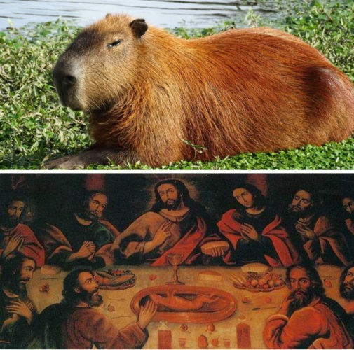 На фото — капибара, исполненная чувства собственной значимости для католичества. И та самая фреска, где Иисус с апостолами ужинают морской свинкой. Вид у всех какой-то встревоженный. По-моему, они пытаются понять, что принес официант. ))