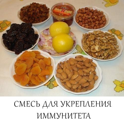 1) Пропустить через мясорубку 1/2 стакана изюма, 1 стакан ядер грецкого ореха, 0,5 стакана миндаля (очень хорошо добавить кедровые орешки - супер поднятие иммунитета), кожуру 2 лимонов. Сами лимоны выжать в массу, кожуру же пропускать через мясорубку отдельно. Далее добавляем 0,5 стакана кураги и столько же чернослива, 150 грамм меда. Настаивать 1-2 дня в темном месте, хранить в холодильнике, принимать взрослым по 1-2 столовые ложки 3 раза в день, детям с трех лет по 1 чайной ложке 2 раза в день.