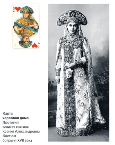 Создатель русской военной авиации великий князь Александр Михайлович был женат на сестре царя Ксении Александровне — ее фотография в костюме боярыни XVII века послужила основой для создания червовой дамы.