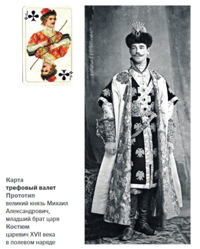 Трефовый валет — великий князь Михаил Александрович, младший брат царя, в полевом наряде царевича XVII века.