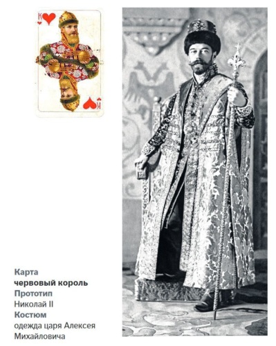 Неординарна ситуация и с червовым королем. Его костюм — это маскарадное одеяние Николая II. "На императоре была одежда, в точности воспроизводившая ту, которую носил в свое время царь Алексей, — малиновая и белая с золотой вышивкой, писала императрица". Однако король лишь отдаленно напоминает царя Николая: придать большее портретное сходство с императором было бы непозволительной дерзостью и оскорблением верховной власти.