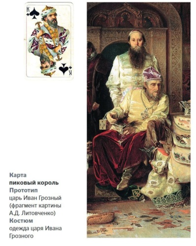 Зато пиковый король вне всякого сомнения похож на царя Ивана Грозного — достаточно взглянуть на известную картину художника Александра Дмитриевича Литовченко "Иван Грозный показывает сокровища английскому послу Горсею". Кстати, на этой исторической картине можно обнаружить щиты, окруженные древнерусским оружием и доспехами, — точь-в-точь, как на тузах в нашей колоде.