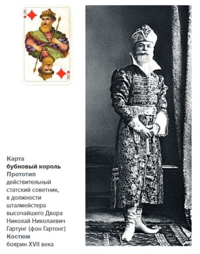 Оттолкнувшись от образа действительного статского советника, в должности шталмейстера высочайшего Двора Николая Николаевича Гартунга (фон Гартонга) и его костюма боярина XVII века, неизвестный художник нарисовал бубнового короля.