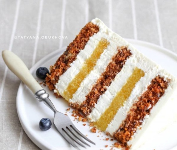 Ароматный морковный бисквит с обжаренными орешками, сочное и яркое конфи из абрикосов и нежный, воздушный крем-чиз на сливках!