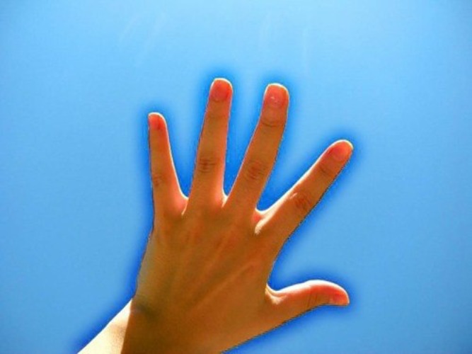 Вот- посмотрите на фотографии- голубой контур вокруг пальцев (он голубой, потому что на голубом фоне, а сам он- прозрачный, принимает цвет фона).