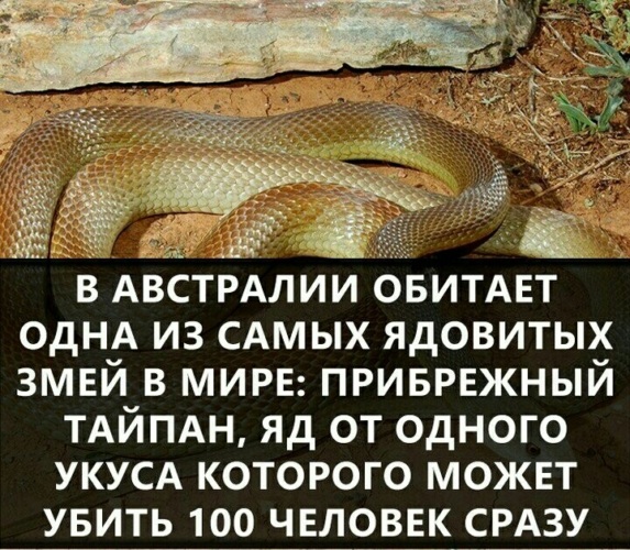 Змея тайпан— среди всех сухопутных, самая ядовитая. Эта ползущая убийца двухметровой длины, тёмно коричневого цвета. Но только в зимний период, к лету она переодевается в более светлую шкуру.