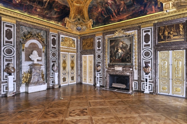 Интерьер салона Дианы в Версальском дворце украшен античными бюстами и скульптурами, расписными стенами, а также золотыми сводами.