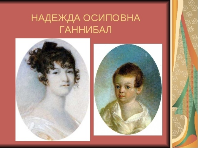 Надежда Осиповна Ганнибал родилась в семье капитана морской артиллерии Осипа Абрамовича Ганнибала и Марии Алексеевны Пушкиной. Родители развелись, и мать целиком сосредоточилась на воспитании дочки. Детство и юность девочки прошли в Петербурге и загородном Кобрине, отсуженном матерью от экс-супруга. Девочка получила классическое домашнее воспитание, много читала, великолепно владела французским. Она отличалась веселым нравом и с юности блистала на балах. В свете она получила прозвище прекрасной креолки. Ее облик дошел до нас благодаря миниатюрному портрету на слоновой кости авторства французского эмигранта Ксавье де Местра.