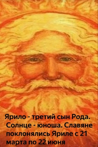 ЯРИЛО - Бог солнца РА, в неистовой Любви и в борьбе со Злом. Солнышко Ясное, озаряющее своим Светом нашу систему Земель. Покровитель Видимого и Невидимого Миров. Бог чистого сердца и светлых помыслов, творящий органическую жизнь. Бог Яви, Нави и Прави. Бог, дарующий людям богатый урожай в одной своей ипостаси, и Бог-воин, олицетворяющий безудержную мужскую силу (это явно проявляется в имени - Ярослав). Отсюда слова: Ярость (неудержимая Сила Яри), БоЯре (сильно Ярые мужи, пышущие здоровьем и красотой Духа). Зимой Ярило является на Землю в виде морозов. Так же, Образ Ярилы очень сильно проявлен в имени "ЮРА" (Георгий, Гор), как определение - любимого сын РА или несущий в себе Силу РА, не только как "Землепашец" (в переводе с Греческого), но ещё и как - "Копьеносец" (защитник Земли Роусьской, Возвышающий Славу Рода Расы).