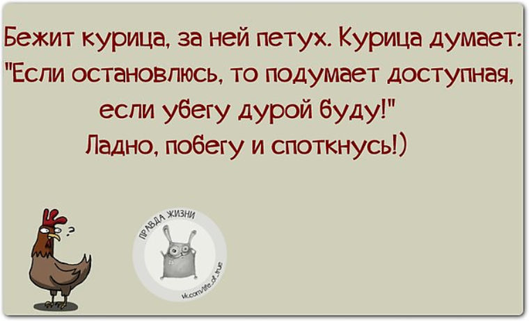Бежит курица, за ней бежит петух. Курица думает: ,,Не слишком ли я быстро бегу, вдруг петух не догонит? '' А петух за ней бежит и думает: ,,Если не догоню, так хоть согреюсь"" - вот такой есть вариант...