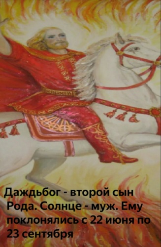 Древние славяне считали Солнце, Молнию и Огонь — два небесных Пламени и одно земное — родными братьями, сыновьями Неба и Земли. Идол его стоял на холме в Киеве. Наши предки верили, что Дажьбог покровительствует свадьбам, встречает жениха на рассвете в день бракосочетания.