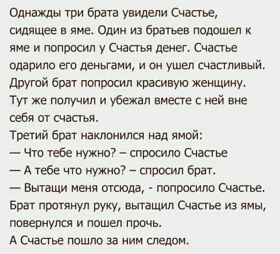 Наталья, Здравствуйте! Смысл жизни не рой другому яму сам в неё попадежь.А вот кто выташит тебя из этой ямы и есть наше СЧАСТЬЕ.