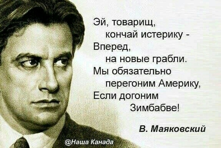 Андрей, 4261. Зимбабве и Маяковский Виктор Авин Въ Пути Призрак Маяковского бродит по нашей Зимбабве: "Эй, товарищ Кончай истерику Наступай на новые грабли. Мы обязательно Перегоним Америку, Если сначала догоним Зимбабве" (с) приписан Маяковскому *** А погуглить? во времена Маяковского Зимбабве называлась иначе. "Эй, товарищ, кончай мухлевать, Прикрываться именем классика. Стих хороший твой, что скрывать, Им наелся Маяковский досыта, А ты, который его имя украл, Из-за понта, словца и хохмы, Так и будешь по сети кочевать, Пока твои руки
