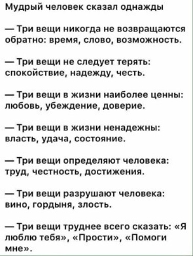 Не просите прощения все равно не простят. Не признавайтесь в любви посчитают за слабость и будут пользоваться. Не просите о помощи если нечего дать взамен не помогут.