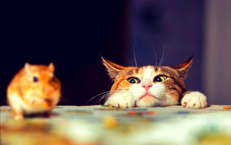 Кот Чемодан, больше всех любит хомяка. Глаза проплакал смотреть, как хомяк моется, жрёт сено, какает и роет лаз на волю. Кот мечтает хотя бы поцеловать эти ушки и глазки. Но с хомяком его фатально разделяют мои предрассудки.