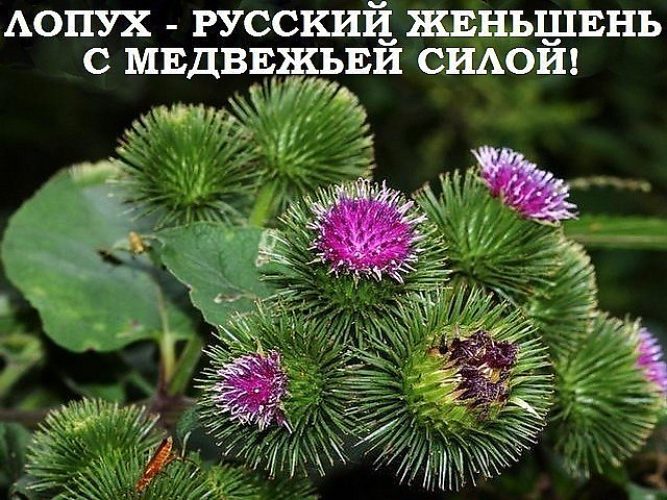 Лопух - русский женьшень с медвежьей силой Используется как пищевое растение и для лечения рахита, при аллергиях, диатезах, почечнокаменной болезни, подагре, сахарном диабете, холецистите, гепатите, запорах, геморрое, экземе, псориазе, артритах, облысении, фурункулах, сыпях; лихорадках, мастопатиях, задержке месячных, в онкологии. Действует как потогонное, мочегонное, жаропонижающее, противовоспалительное, антитоксичное, витаминное, сахароснижающее, обменное, слабительное, желчегонное, противозудное, противоопухолевое средство. В лечебных целях используют цветы, листья, корни, семена, сок. Листья: молодые - идут в салаты, супы, приправы, соленья. Прекрасный источник витамина С. Зрелые листья собирают в период цветения без черешков, высушивают и измельчают. Корни: выкапывают, отряхивают от земли, удаляют подгнившие и отмершие части. Моют, разрезают вдоль и сушат при температуре до 50С. Если измельчать корни шинковкой, то сушка проходит быстрее и потери качества минимальны. В последующем высушенные пластинки корня легко измельчать в муку. Собирают корни лопуха первого года сразу после первых заморозков, а весной - до появления 3-4 листьев. Семена: собирают в период полной спелости, после первых заморозков, во время выкапывания корней первого года (в ямки всегда бросайте несколько корзинок с семенами!). Корзинки высушивают, семена вымолачивают (выбивают). Это сильное мочегонное средство (отвар 1:10), 1 стакан на 3-4 приема. Цветы: собирают и сушат (май-июнь). Используют как мощное противоаллергическое средство, особенно при кожных болезнях, бронхиальной астме и др. Лекарственные формы Порошок из листьев: по 1 ч. ложке 3-5 раз в день до еды, запивая водой, чаем, при желудочно-кишечных, кожных заболеваниях, подагре. Порошок из корня: по 1 ч. ложке 3-5 раз в день до еды при сахарном диабете и для его предупреждения. Принимать 3 недели с таким же перерывом. Настой листьев: 1 ст. ложка измельченных листьев на 1 стакан воды, выдержать 20 мин. на водяной бане (или 5 мин. кипятить), настаивать 1 час, процедить. Принимать по 1 ст. ложке 3-4 раза в день до еды. Регулирует (слабит) пищеварение, помогает при облысении, выводит соли. Для лечения суставов, остеохондроза в бане выпивают глотками 3-5 стаканов такого настоя с медом, наносят мазь из лопуха на больные суставы. Настой корней: 2 ст. ложки измельченных корней варить в 400 мл воды 20-30 минут, настоять полчаса, процедить. Используется для примочек: фурункулы, раны, зудящие дерматозы, при облысении. Настой семян: 1 ст. ложка на 200 мл воды, выдержать 30 мин. на водяной бане, настаивать 1 час. Принимать по 50 мл 2-3 раза в день до еды при отеках, водянке. Сок листьев: чистые листья секут или рубят (без промывания водой), пропускают через мясорубку, отжимают вручную, соковыжималкой или прессом. Смешивают в пропорции 1:1 по объему с сахарным песком. Добавляют водку или спирт, чтобы доля алкоголя в готовой смеси составляла 8-10%. Хранить в холодильнике или подвале в течение 1 года. Суточная доза - 2-3 ст. ложки в настой трав или по 1 ст. ложке на полстакана воды 2-3 раза в день до еды. Курс - 3 месяца. Свежий корень: 1-й способ: тщательно моется, измельчается на крупной терке, смешивается с медом 1:1, хранится в холодильнике. Принимать по 1 ст. ложке 2 раза в день до еды. 2-й способ: тертый корень смешать с коньяком и лимоном 1:1:1. Прием по 1 ст. ложке 2 раза в день за полч