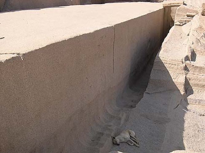 Интересно другое. Раз уж древние египтяне начали вырезать подобный монолит, значит, они собирались его как-то транспортировать и устанавливать. И тогда возникает вопрос: каким образом монолит, расположенный внутри скалы и окруженный узкой траншеей по периметру, можно было отделить от каменного массива?