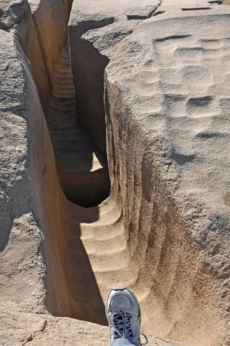 Боковые стороны обелиска и окружающей его траншеи имеют следы большого округлого инструмента. Впрочем, аналогичные следы встречаются во множестве. И похожи они, скорее, на следы от гигантской стамески. Но можно ли представить себе стамеску с рабочей кромкой в 30 сантиметров, режущей гранит, словно пластилин? На самом монолите, кстати, имеются многочисленные следы пропилов и традиционной техники колки при помощи клиньев. Но они оставлены явно в более поздние времена, и эти попытки не нанесли существенного урона монолиту — ни расколоть, ни распилить его не удалось.