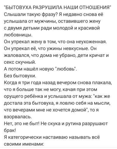 Но по разному бывает.Я вот много лет и пахал и готовил и убирался и надоело и развод. Именно быт.Еще Маяковский писал:Корабль любви разбился об быт