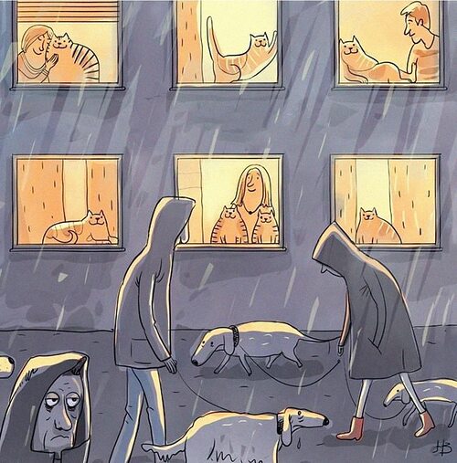 Ну собачки не такие грустные)им похуй дождь и слякоть)скачут и нюхают все что обоссано до них)а вот мыть их потом)))))весело)))