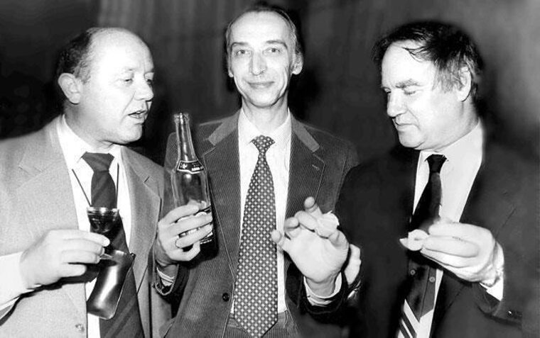 Юрий Сенкевич, Александр Иванов и Сергей Капица соображают на троих. Москва, СССР, 13 января 1989 года.