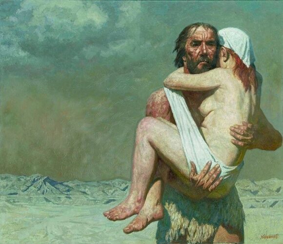 А тут, как я понимаю, они - уже скитальцы, и довольно давно. Рай - в прошлом, а в настоящем - тяжёлый путь, борьба за выживание, палящее солнце, голые камни, только усталость, натруженные мышцы, иссохшая кожа.