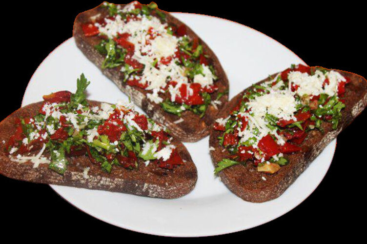 3. Смазать ароматные чесночные тосты творожным сыром. Выложить сверху шампиньоны. Можно добавить немного черного молотого перца. И положиь вяленые томаты. Посыпать петрушкой.