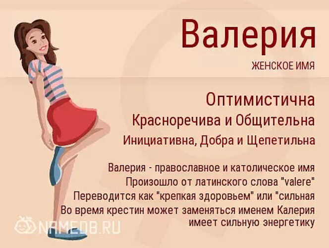 Значение имени Валерия. Характер и судьба. Имя Валерия произошло от латинского слова "valere", как и его мужская вариация, и переводится как "сильная" или "крепкая здоровьем". Считается православным. При этом часто во время крестин вместо него используют имя-синоним Калерия, которое тоже прочно вошло в наш обиход... Женское имя Валерия считается и католическим, и православным. Оно пользуется большой популярностью в странах с русскоязычным населением, встречается в разных формах в странах Запада, сулит много хороших качеств именуемой им девочке. Сегодня это имя считается одним из популярнейших женских имен... Происхождение имени Валерия латинское Корень имени латинское слово "valere" Перевод "сильная" или "крепкая здоровьем" Синоним имя Калерия Ангел хранитель и покровитель имени: Мученица Валерия Миланская Популярность: Имя Валерия в рейтинге популярных женских имен каждый год занимает аж 10-12 позиции. По статистике приходится минимум на 25 девочек из 1000 новорожденных. Разговорные варианты: Валера, Лера, Леруня, Леруся Современные английские аналоги: Валери, Вэлери. запятнанной однажды репутацией. Если человек уже однажды был замечен во лжи или корысти, то с таким человеком она уже точно не будет общаться. Имя Валерия сегодня считается одним из популярнейших в нашей стране и более того, встречается и в странах Запада и даже в Центральной Европе, но в видоизмененных формах.ХАРАКТЕР ИМЕНИ ВАЛЕРИЯ Характер имени Валерия таков, что дарует на протяжении всей жизни носительнице сего имечка непредсказуемость в действиях, непоседливость, совершение множества необдуманных поступков и кучу ошибок в оценке людей. Характер названной так дамочки сложен по всем параметрам без исключения - может показаться, что за ее добротой и порядочностью скрывается ранимая и добродушная натура, но на самом деле это не так. Она капризна, не любит, когда что-то не получается, любит навязывать свое мнение остальным, и не терпит, когда с нею спорят, таков уж ее характер. А еще характер сего наименования сулит и множество других качеств, среди которых числится неумение приспосабливаться к происходящему вокруг, нежелание прислушиваться к чужим желаниям и идеям, чрезмерная активность и невозможность переубедить ее в чем-либо. Хотя, опять же, это лишь теория, и она может видоизменяться, в зависимости, к примеру, от сезона рождения названной именоформой Валерия девчонки. РАННЕЕ ДЕТСТВО Валерия в раннем детстве представляет собою проказницу, непоседу, непослушную и очень балованную особу. У этой девочки, за счет воздействие, которое оказывает значение имечка, не хватает терпения, она все время в движении, балуется, бегать, двигается, не сидит на месте, вечно придумывает себе дела, проказничает и при этом навязывает такое же поведение всем вокруг. Чаще всего, у девочки, названной именем Валерия, много друзей, а сама она, хоть и не является явным лидером, становится заводилой, организатором, человеком, у которого постоянно имеется кучу идей. Не удивительно, что на многих деток у нее такое же влияние, какое оказывает значение ее имечка, и точно также не удивительно, что родители всех ее сверстников жалуются на ее поведение. Зато с другой стороны Валерия обладает такими чертами как находчивость, мечтательность, развитая фантазия, воображение, коему можно лишь позавидовать, дей