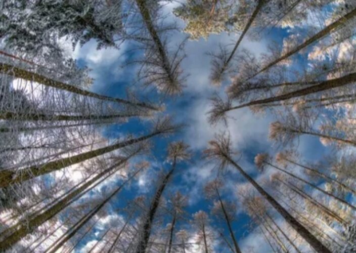 Деревья шпилем в облака, и солнца ларами коснулись, зима вступив в свои права, снегами все запорошила, и солнце светит днем так мало, и облака как покрывало висят над лесом словно манна