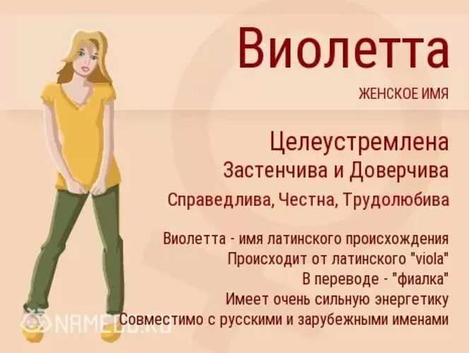 Имя Виолетта сегодня встречается нечасто, и поэтому считается редким, но пользуется спросом заграницей, особенно в европейских странах. Имеет отличную значимость и интересную совместимость со знаками зодиака, и сильную энергетику, сулящую много хорошего носительницам...