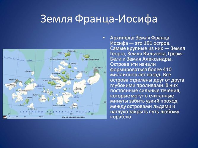 Российский арктический архипелаг Земля Франца-Иосифа находится к востоку от Шпицбергена и к северо-западу от островов Новой Земли, далеко за Полярным кругом и на расстоянии менее тысячи километров от Северного полюса. Почти все из 196 островов архипелага находятся севернее 80 с. ш. Продолжительность полярной ночи в этих местах 125 суток, а полярного дня — около 140.