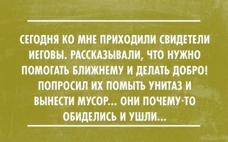 Когда - то и ко мне приходили. Спрашивают: - вы верите в бога? - Я отвечаю: - нет. - Почему? - А зачем? - Больше вопросов не было. Хотя они надоедливые как мухи.