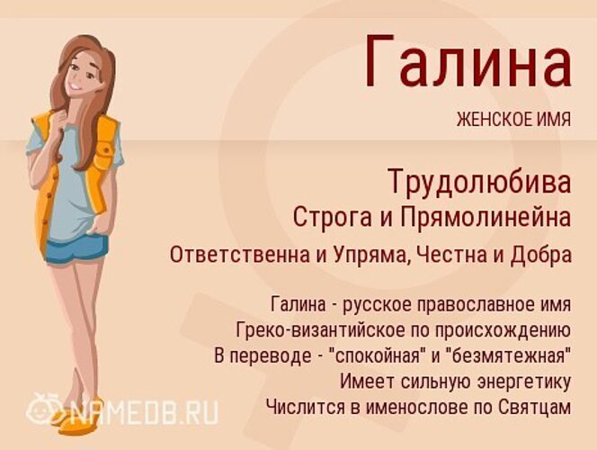 ЗНАЧЕНИЕ ИМЕНИ ГАЛИНА, ХАРАКТЕР И СУДЬБА.Русское православное имя Галина трактуется в русском языке как "спокойная" и "безмятежная". Но имеет далеко не русские корни. Считается, что появилось оно благодаря древнегреческой культуре и имени одной из мифических нимф Нереид, которую звали Галена. Женское имя Галина пользовалось спросом во времена существования Советского Союза, и сегодня продолжает оставаться популярным во многих странах его бывших территорий. Оно обладает хорошей значимостью и сулит новорожденной девочке много хороших качеств... Происхождение имени Галина греко-византийское В корне имя нимфы Галены Буквальная трактовка "спокойная" и "безмятежная" Ангел хранитель и покровитель имени: Мученица Галина Коринфская