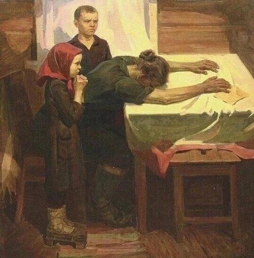 Отец художника погиб незадолго до Победы, в феврале 1945 года. Поэтому в картине полностью отражены детские впечатления художника и его семьи, понесшей непереносимое горе утраты.