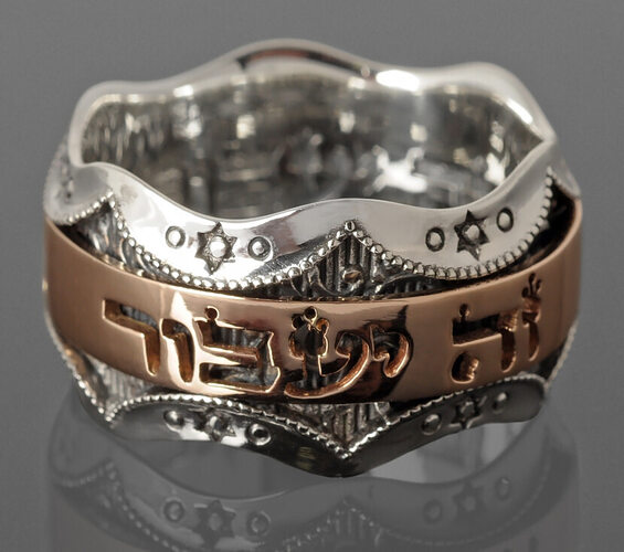 Кольцо из желтого золота выполнено с прорезными буквами на иврите...