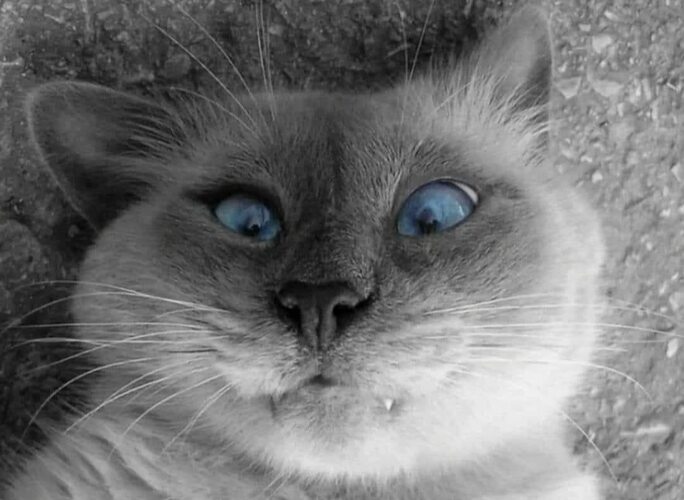 Леденящую кровь историю поведали мне. Одна добрая дама подобрала кота. А было так: только она собралась опустить пакет мусора в мусорку подле дома, как из бака медленно, что перископ, показались голубые глазищи в обрамлении облезлой шерсти цвета апрельского снега на обочинах наших дорог. Морда взглянула жалобно и издала слабое "Мя... Мя...".