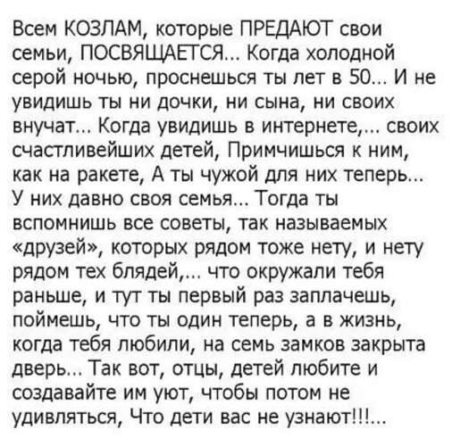 Татьяна, Я не сказала, что все плохие! У меня замечательный сын! А мама живëт у меня, потому что нужен уход! Но не надо огульно всех в козлы записывать! Кто был с козлом, та коза! Иначе ни как. С ослом ослица, с дураком дура, с генералом генеральша и т. д.!