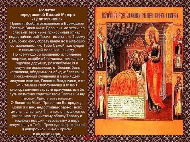 3. Икону Божией Матери "Целительница" всегда можно узнать по изображению Пресвятой Богородицы возле постели больного человека. лавился чудесами исцеления от различных душевных и физических болезней еще в конце XVIII века. Помощь Пресвятой Богородицы от Ее чудотворной иконы продолжается и в наше время