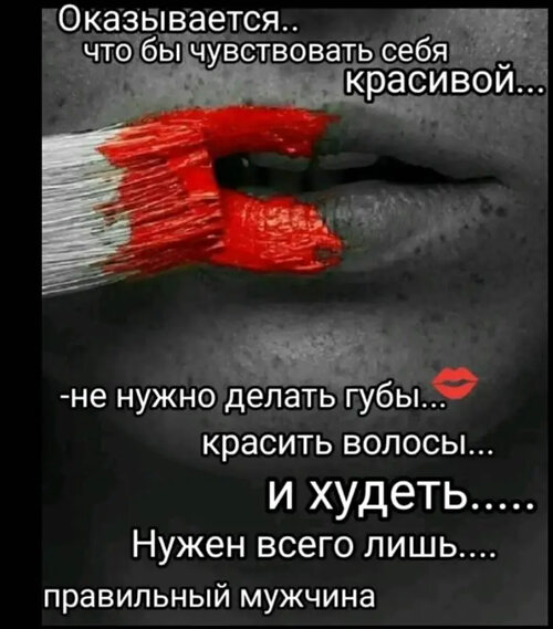 Когда мужчина любит женщину, он любит её любой(ненакрашенной, накрашенной, больной, здоровой, грустной, счастливой, стройной, толстой, доброй, стервозной и т. д...).... Если не любит, то не помогут не бриллианты, не статус.... Просто потому, что не любит....
