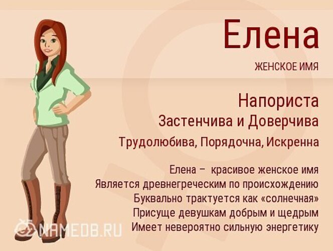 Значение имени Елена. Характер и судьба.Имя Елена по происхождению считается древнегреческим, хотя присутствует и в именослове латинских имен, и в именослове греческих. Буквальная его трактовка звучит как "солнечная", а по второй версии - "солнечный свет". На данный момент насчитывается более 10 производных имен-синонимов с такой же трактовкой. Женское имя Елена считается современным и достаточно популярным, ведь встречается довольно часто. Притом, оно популярно не только в России, но и в других странах СНГ. А еще имеет сильную энергетику и отличную совместимость с большинством мужских имен... Происхождение имени Елена древнегреческое Буквальная трактовка по первой версии "солнечная" Трактовка по второй версии "солнечный свет" Ангел хранитель и покровитель имени: Равноапостольная царица Елена Популярность: В рейтинге популярных русских женских имен имя Елена занимает 36-39 позиции и приходится по статистике примерно на 6-9 девочек из 1000 новорожденных. Разговорные варианты: Лена, Леночка, Ленуся Современные английские аналоги: Олёна, Хелен, Эллен ЗНАЧЕНИЕ И ТОЛКОВАНИЕ ИМЕНИ Астрологи считают, что значение женского имени Елена сулит современным новорожденным девочкам такие черты характера как мнительность, возбудимость, эмоциональность, впечатлительность, влюбчивость, безответственность и невнимательность, непостоянство, действенность, чрезмерная активность и подвижность, непоседливость. Обычно же Елена, это серьезная девушка, но обладающая рядом минусов - например, она не умеет заканчивать начатые дела, обидчива, капризна и непостоянна. Впрочем, все это лишь общие очертания натуры. На самом же деле в каждом отдельном случае характер может быть непохожим на остальных... Достоинства и положительные черты: добрая и вежливая, старается никогда не поступать плохо в отношении людей, много двигается, всегда чем-то занята, не ленится, и самое главное, трудолюбивая. Именно за счет последнего-то качества Елена и может многого добиться в жизни. Елена плохо относится к людям с завышенной самооценкой и к тем, кто пытается ею манипулировать, ну или пользоваться ее добротой. Она никогда не подпустит к себе подхалима, корыстного человека или обманщика. Имя Елена присутствует в разных культурах мира, но везде звучит по-разному: Хелена, Хелен, Алина, и т.п. ХАРАКТЕР ИМЕНИ ЕЛЕНА По мнению большинства исследователей, характер имени Елена таков, что дарует носительнице сего наименования множество хороших, но зачастую конфликтующих друг с другом качеств. К примеру, имеется доброта, за счет которой помощь сможет получить каждый без исключения, но есть и противовес в виде такой черты как корыстность, за счет которой доброта в основном проявляется только там, где от нее Елена сможет получить выгоду. И таких примеров множество, таков уж характер. А еще, характер предполагает сильную амбициозность, мешающую Елене порою проявить те хорошие стороны ее сущности, которые имеются. Впрочем, характер, как и многое другое, зависит от множества различных факторов, тут, как не крути, а характер самой именоформы играет не наисильнейшую роль. Например, он может видоизмениться в зависимости от времени года рождения девочки, названной Леной. РАННЕЕ ДЕТСТВО Ранее детство девочки с именем Елена, это период разочарования и постоянных капризов, хотя на самом деле эта м