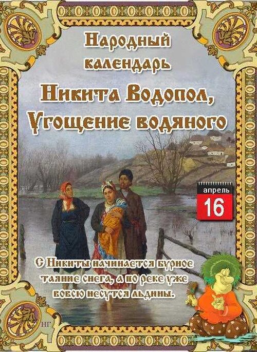 16 апреля (3 апреля по старому стилю) по народному календарю отмечается Никита Водопол. В эту же дату православные верующие чествуют память святого Никиты Исповедника, благодаря которому и назван день. Жизнь Никиты началась в VIII веке в праведной семье в Кесарии (на территории современного Израиля). Лишившись родителей, мальчик воспитывался бабушкой, она привила ему любовь к Господу. В юношестве Никита постригся в монахи в Мидикийской обители, стал одним из лучших иноков. Спустя годы его назначили на пост настоятеля (игумена) монастыря. Также он защищал иконы и свою паству от ереси иконоборцев, за что попал в заключение. Через несколько лет после освобождения игумен скончался в своей обители. В народе Никитин день называли Водополом. Из-за быстрого потепления лед ломался на реках, а количество воды увеличивалось. Часто случалось, что реки выходили из берегов, а их воды заливали округу. В редкие годы вода доходила до жилых мест, и крестьяне сталкивались с водой на полу. Оттого и назвали день Водопол. РЕКЛАМА Чтобы предугадать, как сильно разольется вода в нынешнем году, жители наблюдали за уровнем гнездования речных птиц. Также считалось, что крот не роет ходы ниже разлива реки, поэтому по кротовым ямам определяли высоту грядущего разлива. Жители верили, что на Никиту Водопола просыпался от зимней спячки водяной. Его величали хозяином водоемов, говорили, что он заправляет рыбами, как скотовод коровами. Поэтому рыбаки старались задобрить водяного. Ему приносили в дар кашу, куриные внутренности, винные напитки, хлебные корки. Среди рыбаков существовала традиция отдавать в жертву хозяину рек негодную клячу. Ее выкупали в складчину, хорошо кормили накануне и вели на лед реки. Когда слышался стон из воды, лошадь топили. Затем в реку выливали кувшин масла и приговаривали водяному принять дар. Такой обряд гарантировал, что водный хозяин после спячки не будет уводить рыбу в другие места. Если на Никиту Водопола спускался дождь, жители готовились к непогожей весне. Первые громовые раскаты сулили прохладное лето. Увидеть закрывшиеся цветы мать-и-мачехи до захода солнца в данный день предвещало перемену погоды. Плохую рыбалку ожидали, если видели нетронутый лед на водоемах.