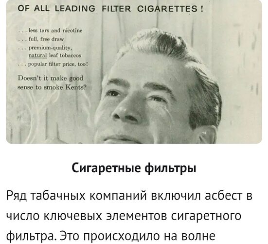 Сигаретные фильтры Ряд табачных компаний включил асбест в число ключевых элементов сигаретного фильтра. Это происходило на волне поднявшегося в 1950-х годах табачного бума: производители пытались убедить потребителей, что сигареты с фильтром — абсолютно безопасны. Наиболее циничны оказались пиарщики Kent, пустившие в продажу 13 миллиардов сигарет с фильтром из наиболее опасного вида асбеста, крокидолита.