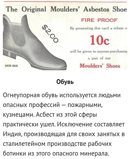 Обувь Огнеупорная обувь используется людьми опасных профессий — пожарными, кузнецами. Асбест из этой сферы практически ушел. Исключение составляет Индия, производящая для своих занятых в сталилетейном производстве рабочих ботинки из этого опасного минерала.