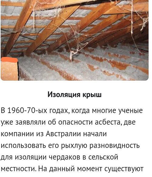 Изоляция крыш В 1960-70-ых годах, когда многие ученые уже заявляли об опасности асбеста, две компании из Австралии начали использовать его рыхлую разновидность для изоляции чердаков в сельской местности. На данный момент существуют еще несколько тысяч домов, загрязненных этим канцерогеном.