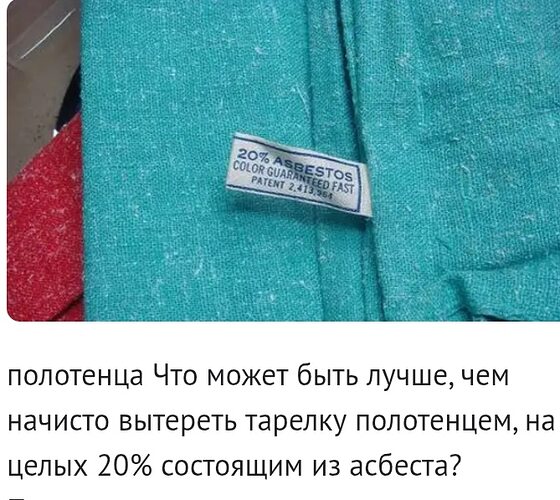 Что может быть лучше, чем начисто вытереть тарелку полотенцем, на целых 20% состоящим из асбеста? Производители уверяли, что этот материал делает полотенца идеальным средством для полировки блюд, и, кроме того, обеспечивает дополнительные абсорбирующие свойства. Что и говорить, так оно и было на самом деле — вот только о канцерогенности асбеста никто заявить не потрудился.