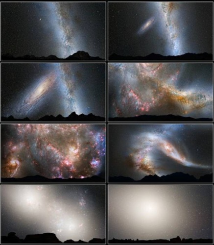 Ночное небо в разное время столкновения Андромеды и Млечного пути, которое начнется через 3 млрд. лет. Фото NASA; ESA; Z. Levay and R. van der Marel, STScI; T. Hallas, and A. Mellinger