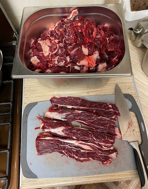 Говяжью лопатку и голяшку разделываем на кусочки ,весом 30-40гр. Солим из расчета 9гр соли на 1кг мяса,перец черный молотый добавляем 2гр на 1кг мяса. Перемешиваем и оставляем при комнатной темп на 1-1,5ч . Банки 0,5 подготавливаем , на дно кладем лавровый лист,примерно с ноготок,перец душистый 1-2 горошка,перец черный горошком 3шт,наполняем по 480гр,закрываем горячими крышками и готовим в автоклаве на режиме пар 120/75.