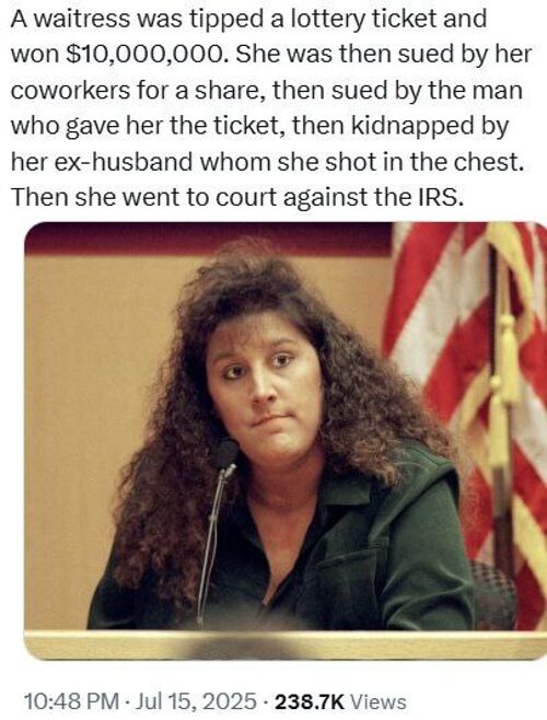 В 1999 году американская официантка Тонда Дикинсон получила от посетителя кафе Эдварда Сьюарда вместо чаевых лотерейный билетик. Билетик оказался выигрышным и сорвал джекпот в размере $10 миллионов. Но радость Тонды длилась не очень долго.